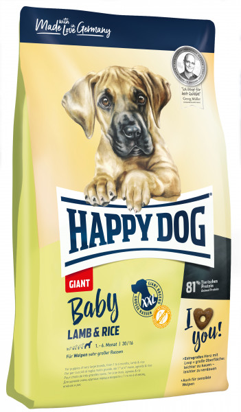 Der optimale Fett- und Proteingehalt unterstützt den Welpen in den wachstumsintensiven Monaten ideal. So kann er Körpermasse und kräftige Muskeln aufbauen. Eine ausgewogene Ernährung sorgt zudem dafür, dass sich Bänder, Gelenke und ein schönes Fell ausbilden. Schmackhaftes Lamm, hochverdaulicher Reis und die wertvolle Neuseeland-Muschel sorgen in Happy Dog Baby Giant Lamb & Rice für eine optimale Entwicklung, auch von sensiblen Welpen. Die Super-Premium Vollnahrung ist dank seiner geflügelfreien Rezeptur auch für sensible Feinschmecker bestens geeignet. Unser Happy Dog Natural Life Concept ® versorgt den Hund mit allem, wovon sein Organismus ganzheitlich profitiert.